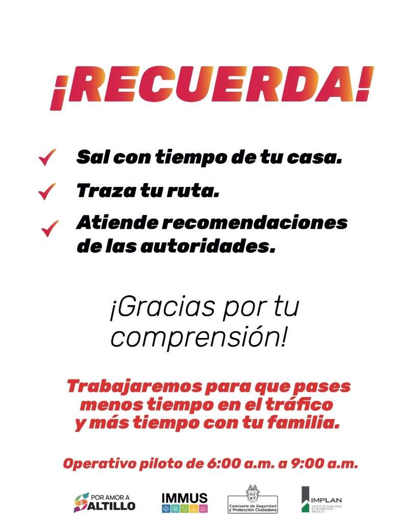 l Gobierno Municipal de Saltillo y el Instituto Municipal de Movilidad Urbana Sostenible, informan a la población que este viernes 24 de enero se llevará a cabo un operativo piloto en el distribuidor vial El Sarape, como parte de la estrategia para reducir el congestionamiento vial que se registra en esta zona.